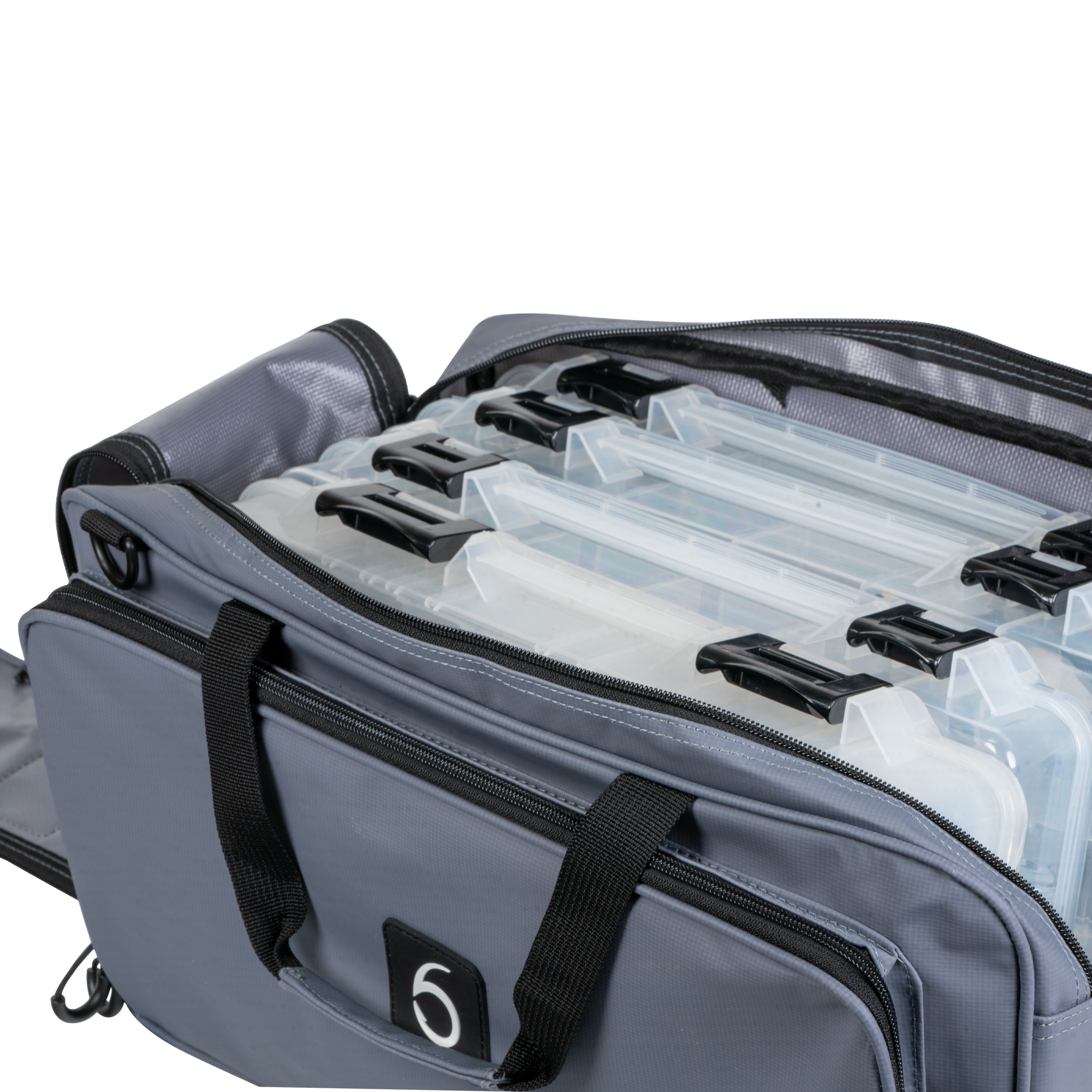 Zippered side pockets for soft plastics, tools, line, and loose tackle